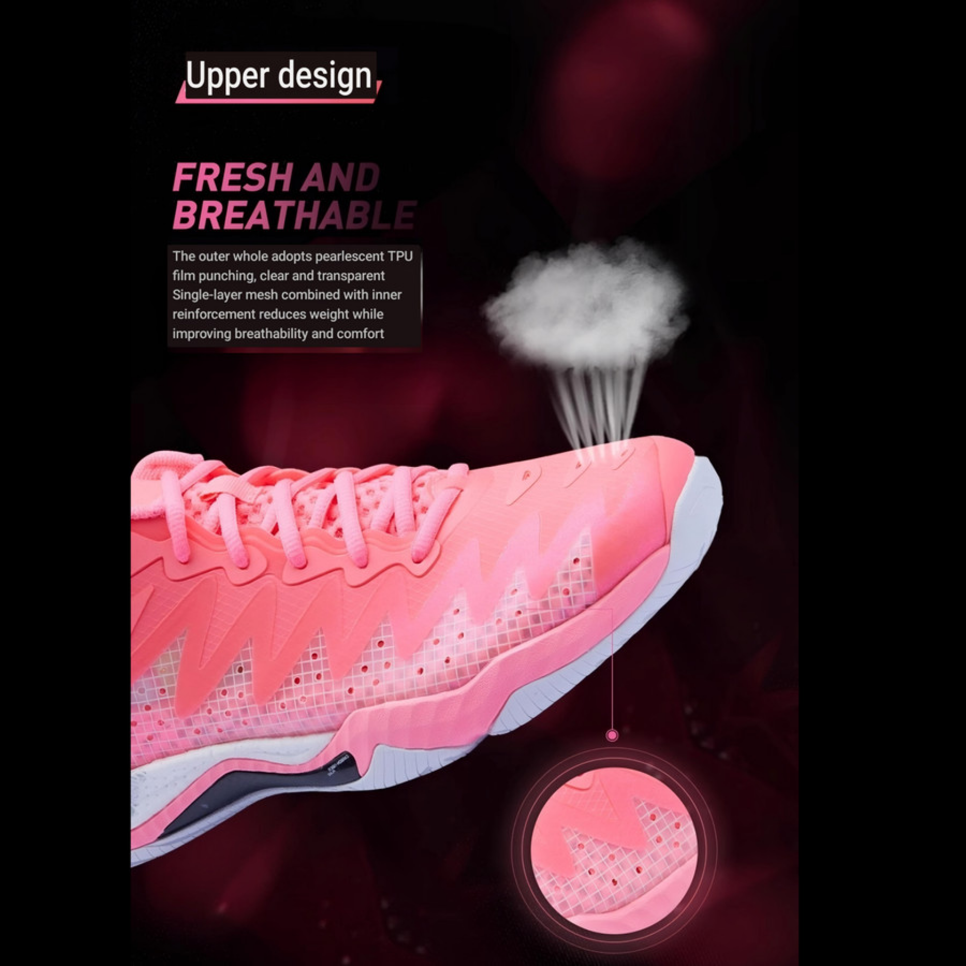 The Gyrfalcon V is built with comfort in mind. The upper layer adopts a single layer of mesh combined with the inner reinforcement to reduce weight and improve breathability and comfort. The outer side is perforated with a pearlescent TPU film as a whole, which is light and transparent and warrants optimum stability and airflow.
